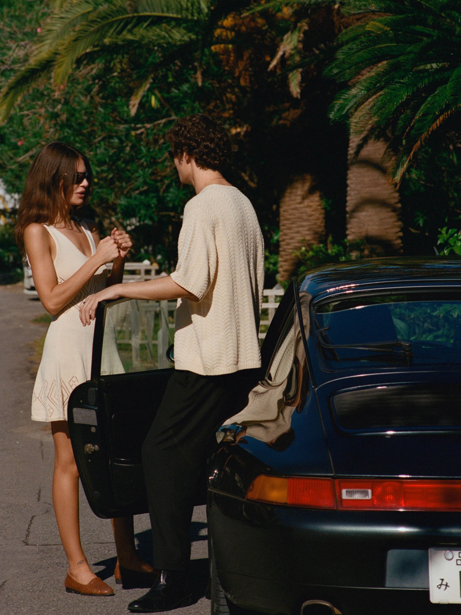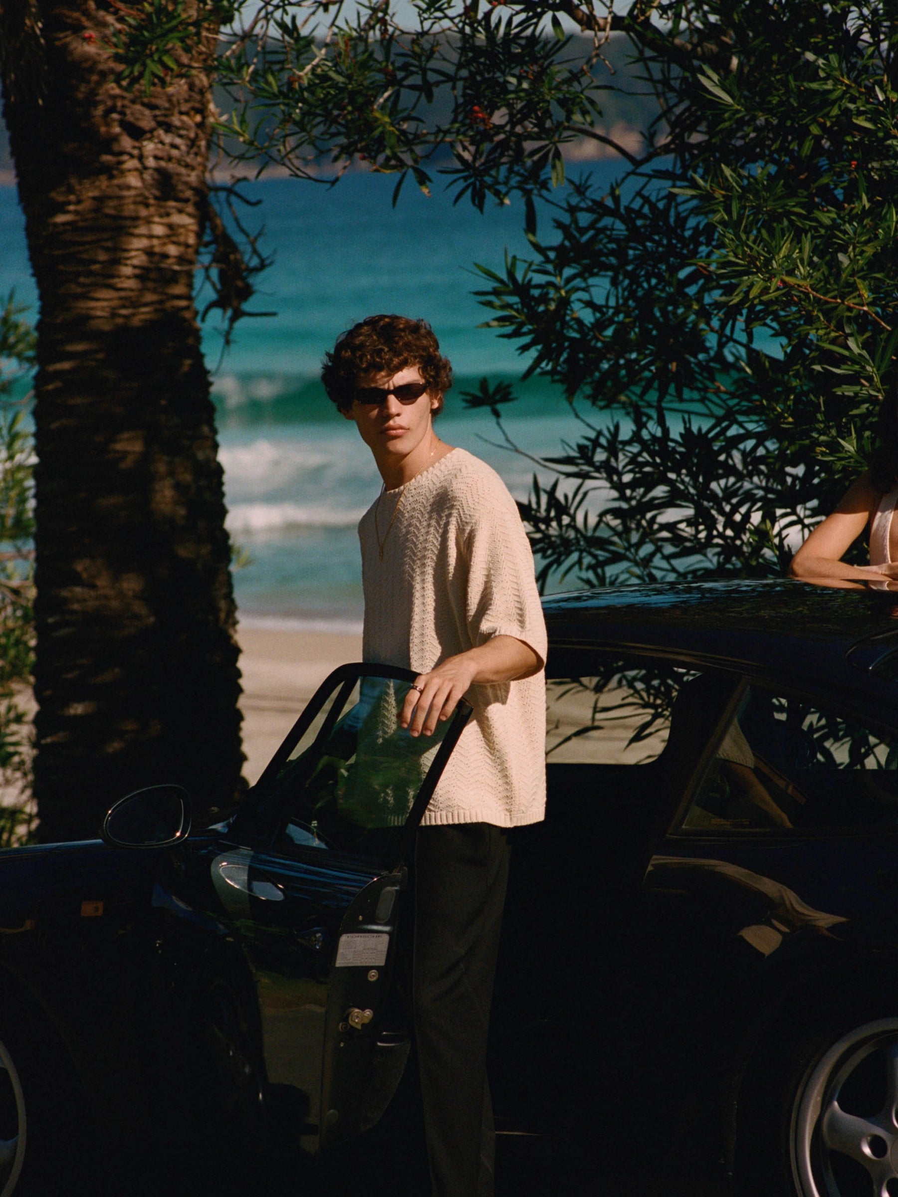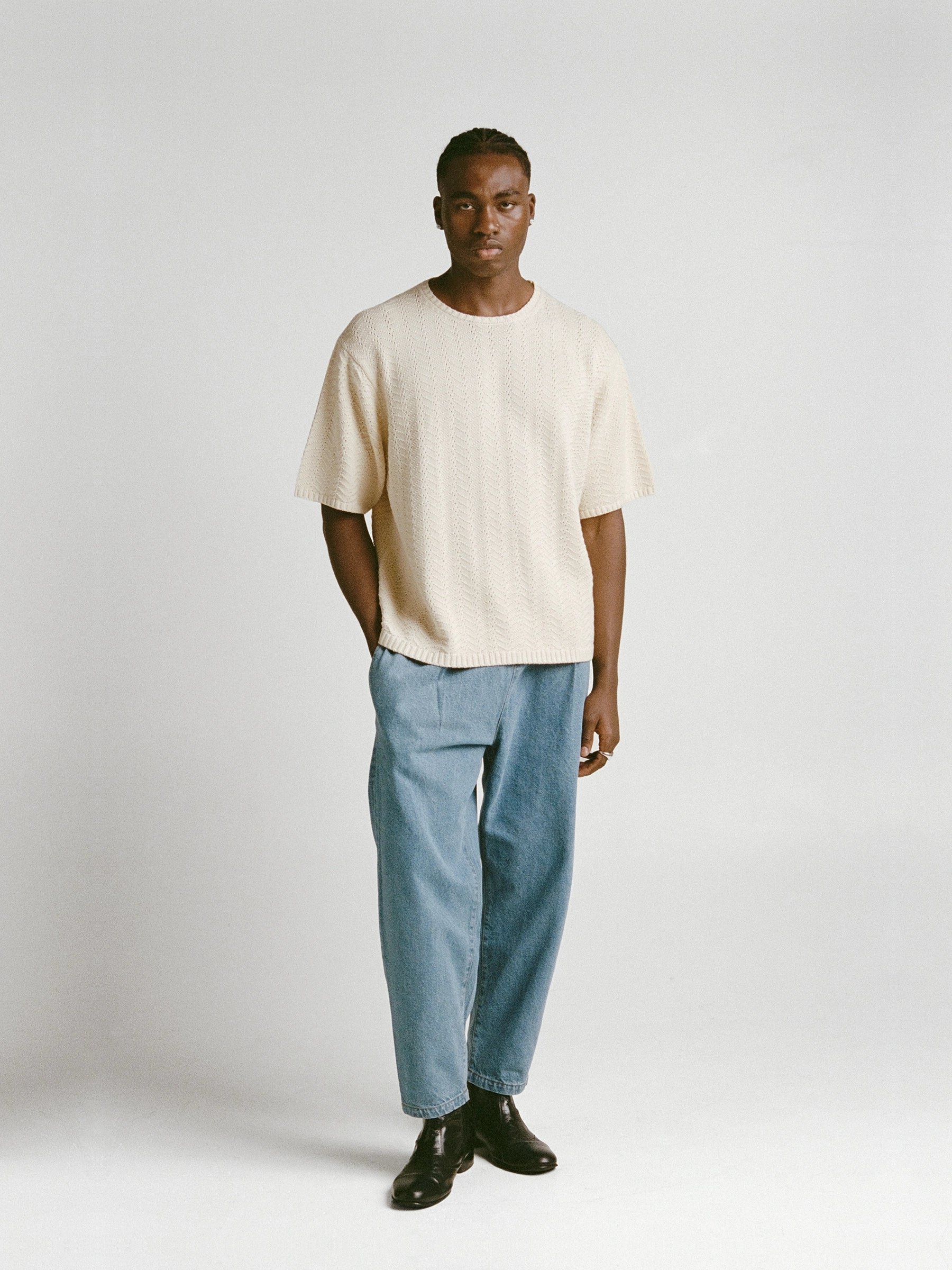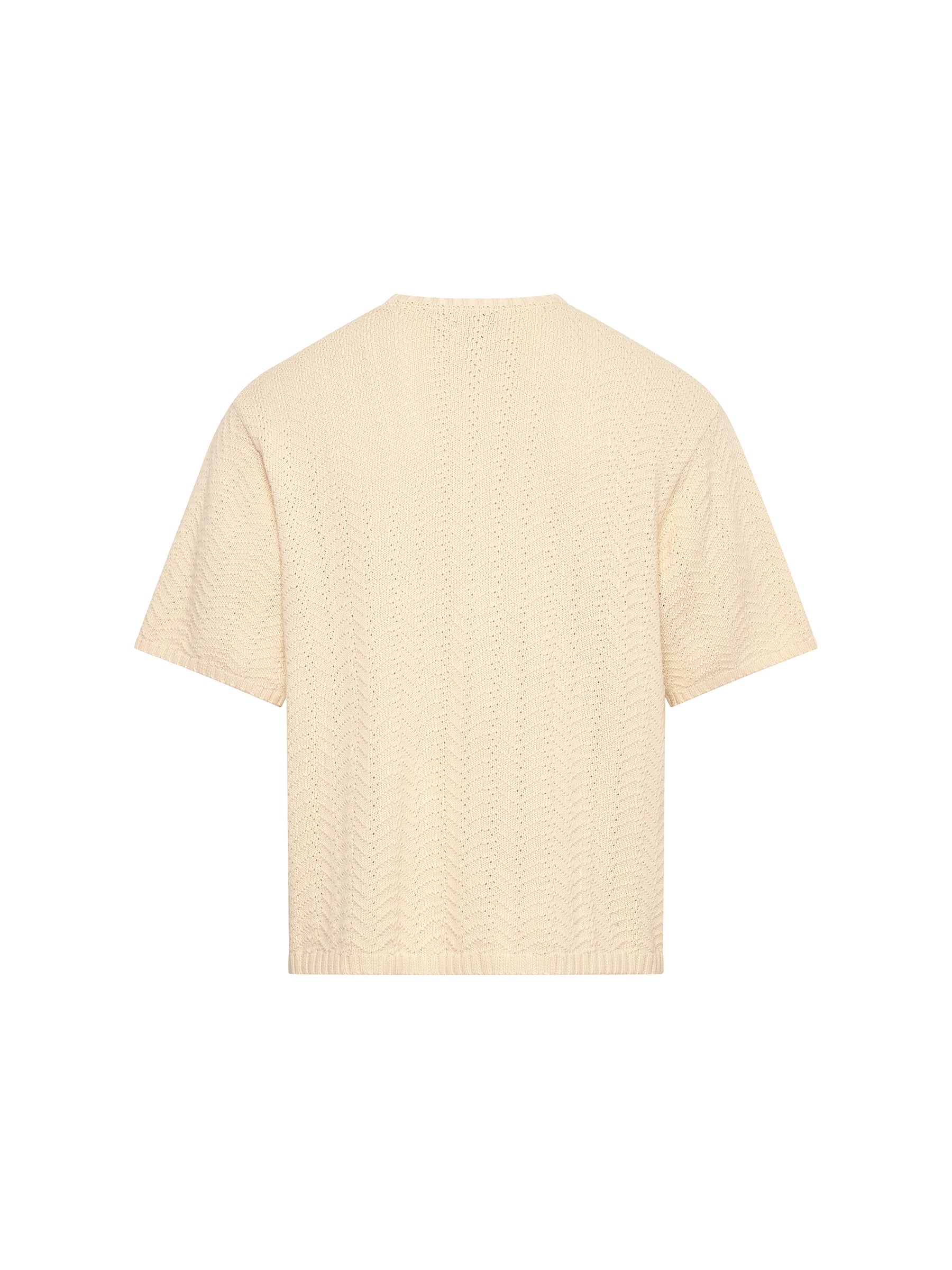 A relaxed fit, knitted cotton shirt with round neckline and chevron textured knit detail. Features a geometric, chevron pattern and rib knit hem and cuffs.